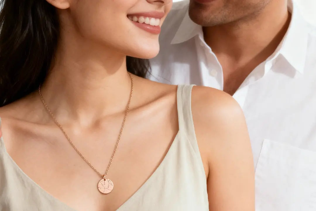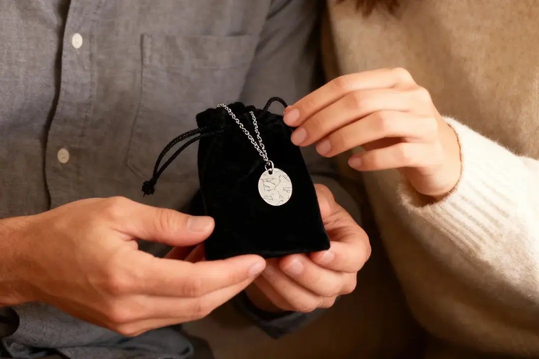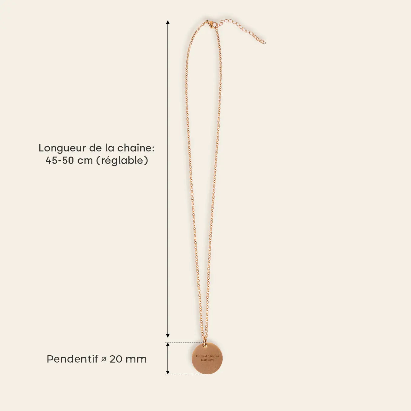 +La chaîne est ajustable de 45 à 50 cm. Le pendentif a un diamètre d’environ 20 mm.