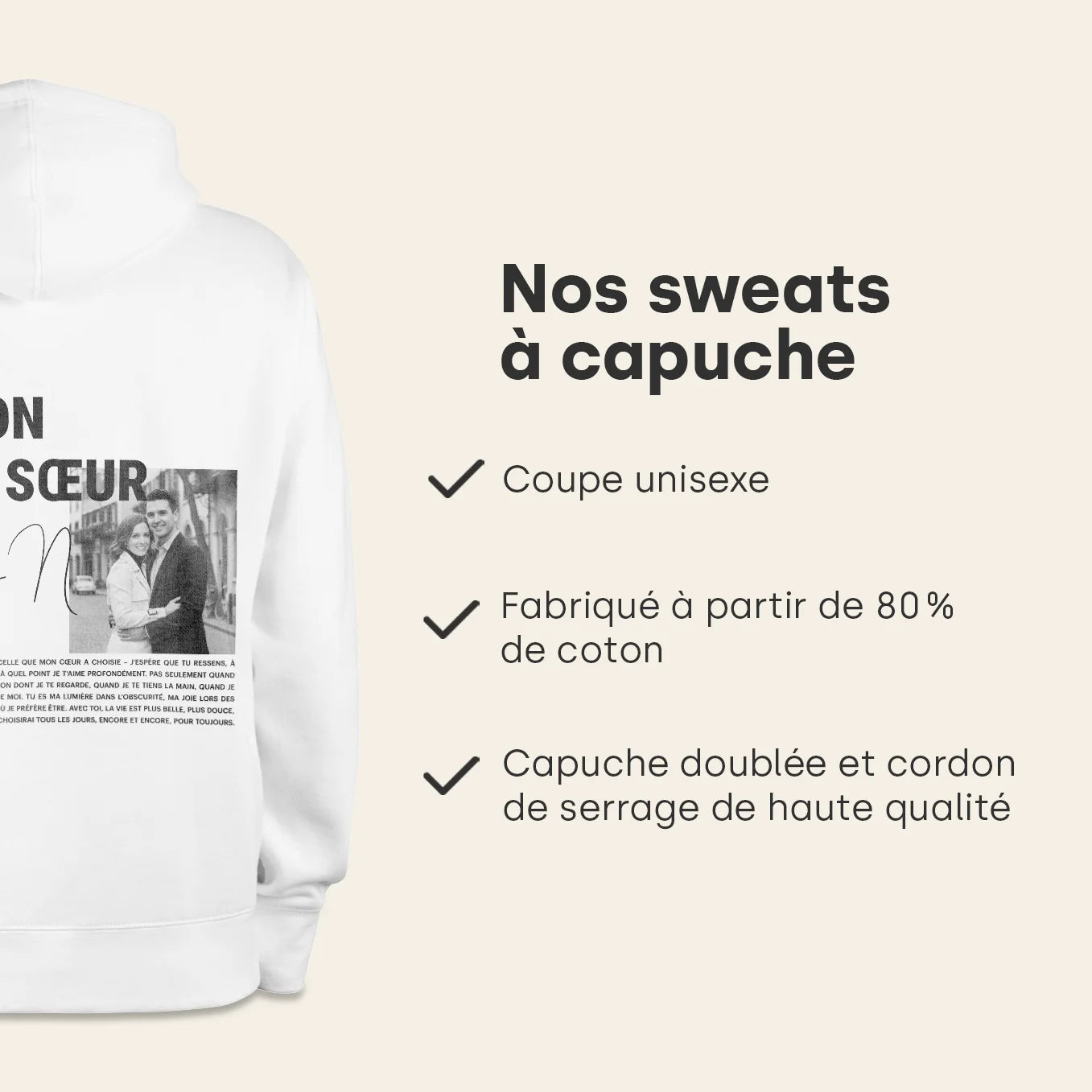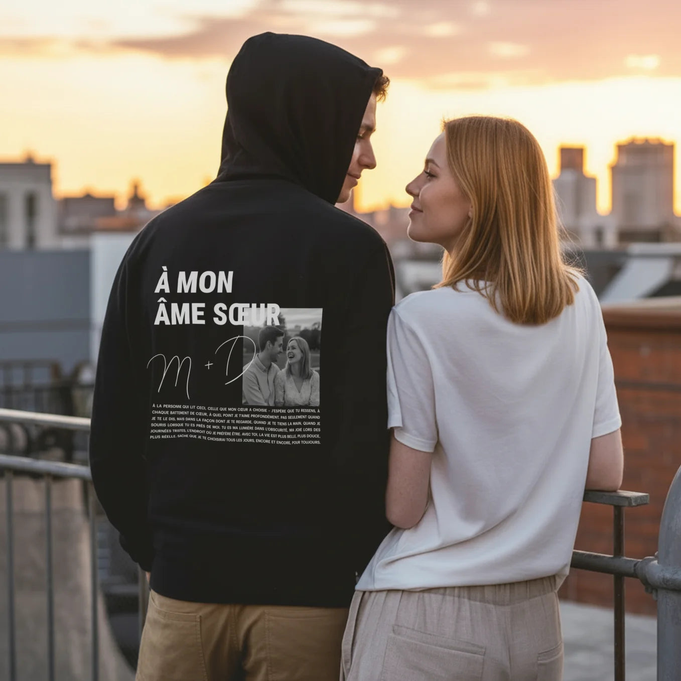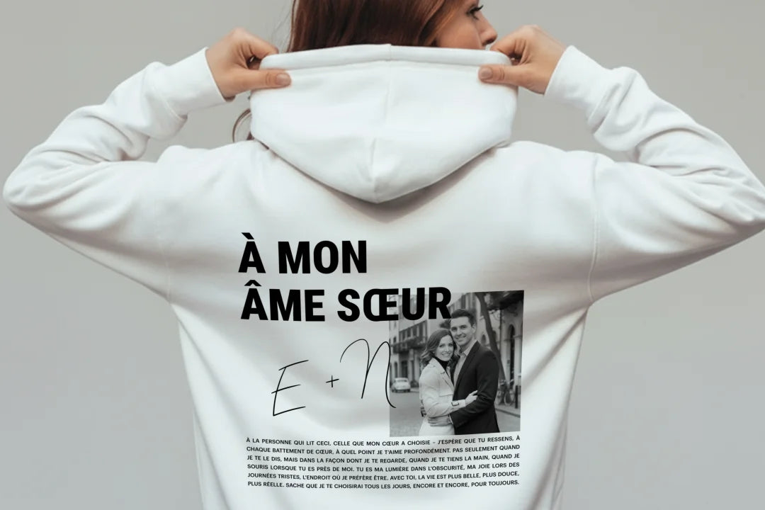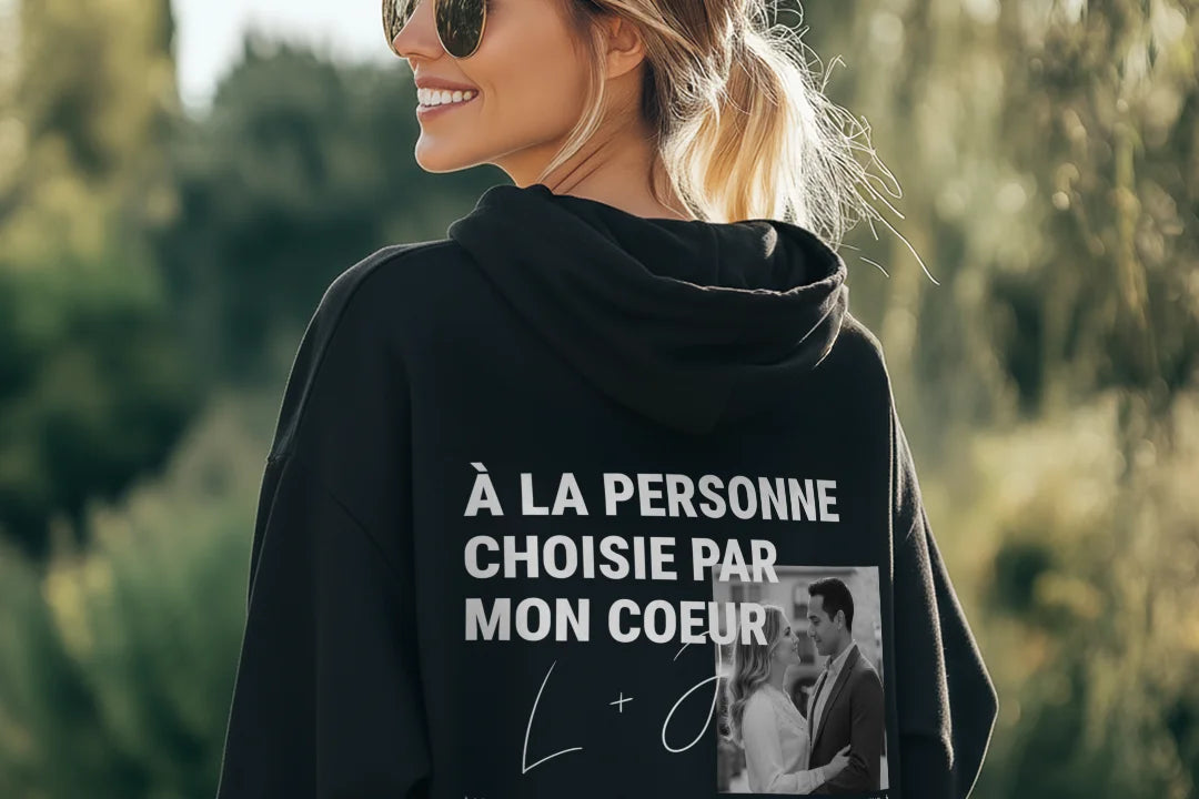 +Le hoodie est imprimé avec soin à partir de votre photo, de vos initiales et du texte de votre choix, pour un rendu de qualité et vraiment personnel.
