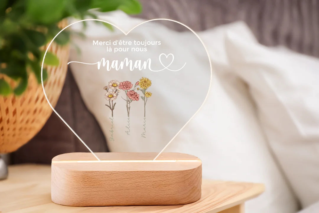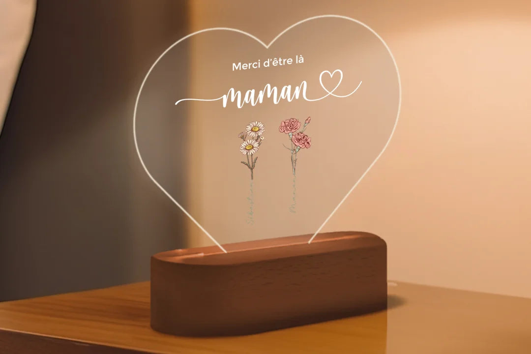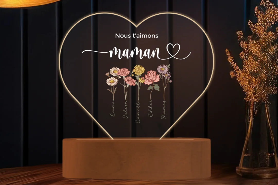 Une lampe acrylique personnalisée en forme de cœur avec des fleurs