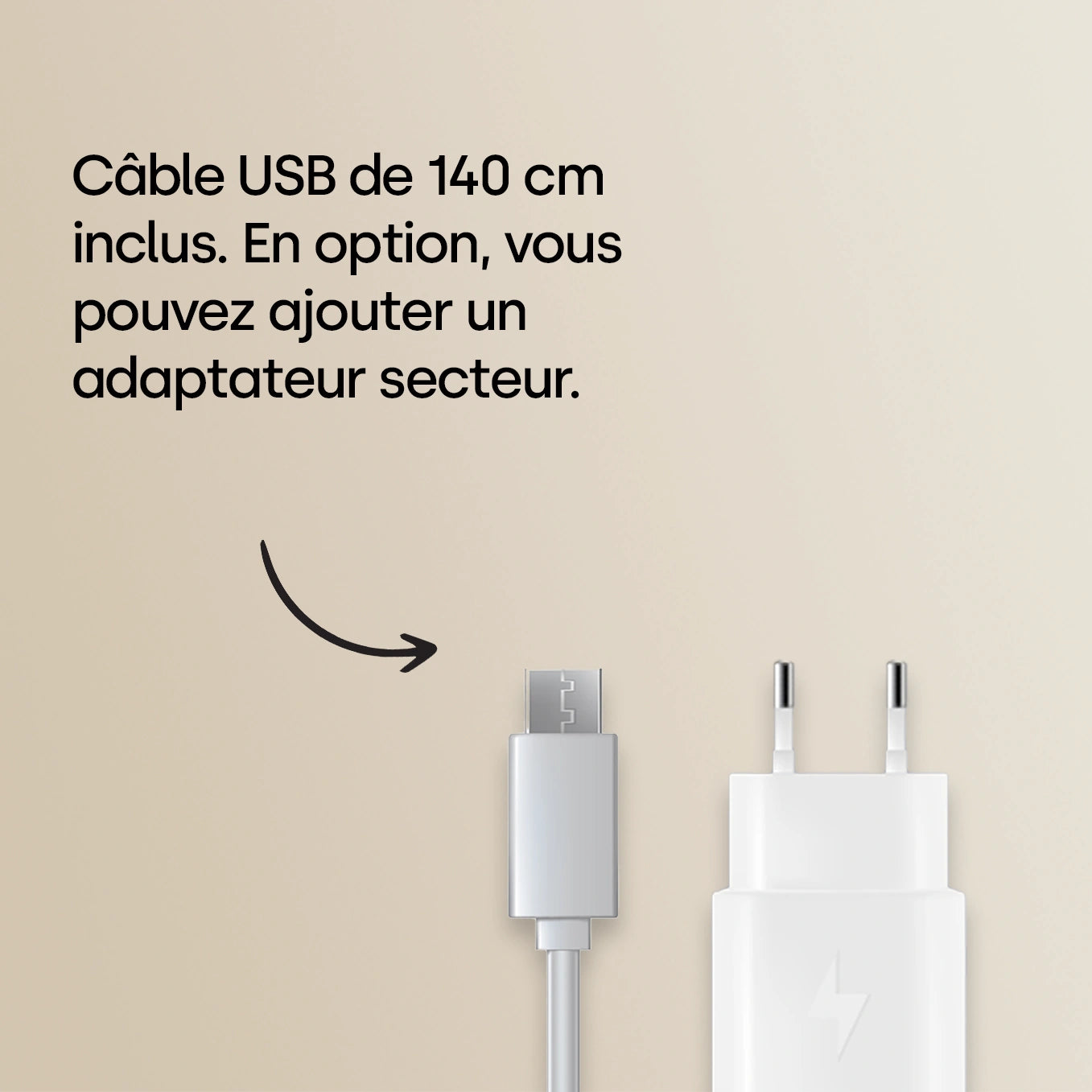 +Oui, un câble USB-C de 140 cm est fourni. En option, vous pouvez aussi commander un adaptateur de prise électrique.