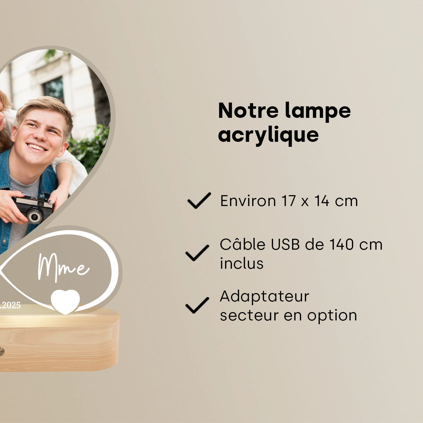 +Le verre acrylique gravé mesure environ 17 x 14 cm et repose sur une base en bois élégante. Les dimensions conviennent parfaitement pour une table de chevet ou une étagère.