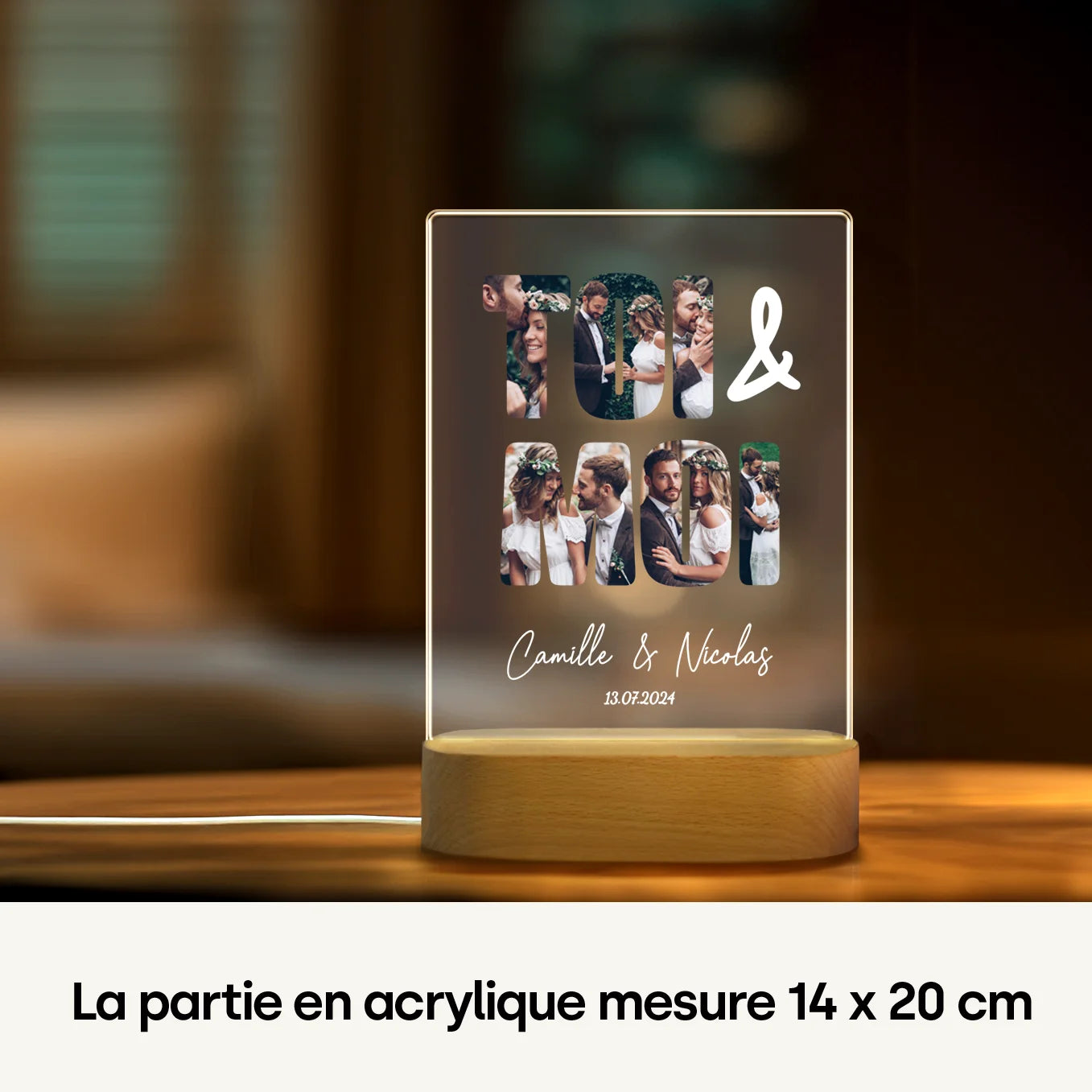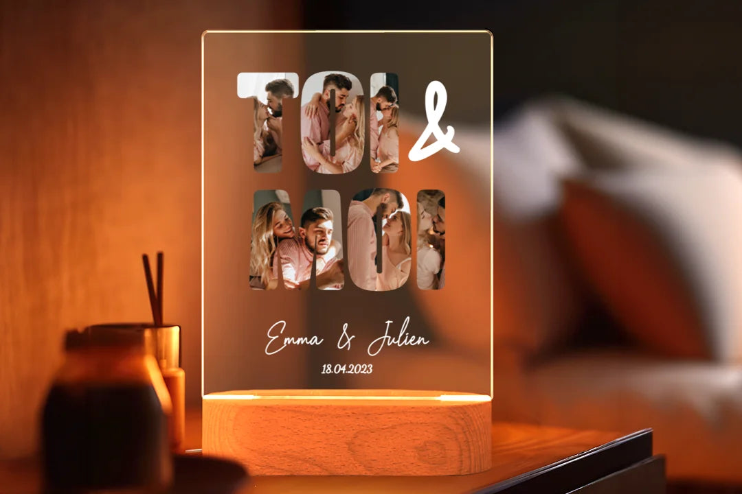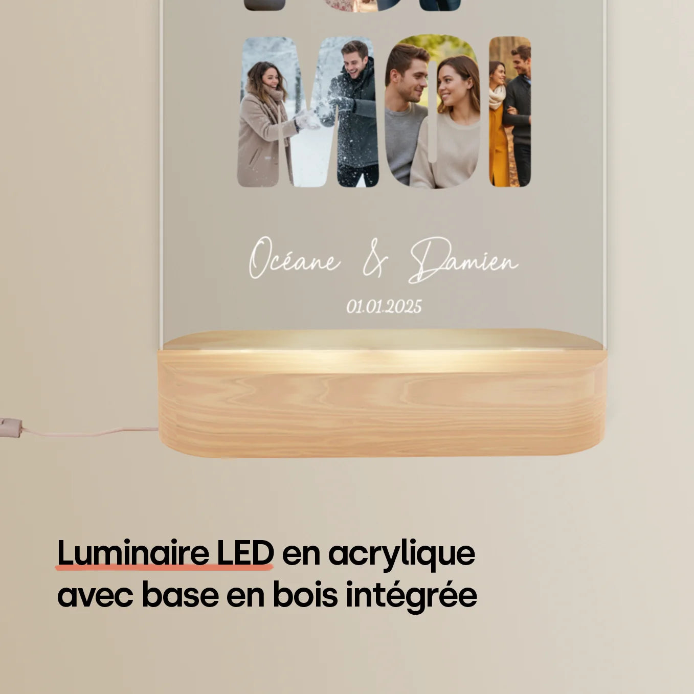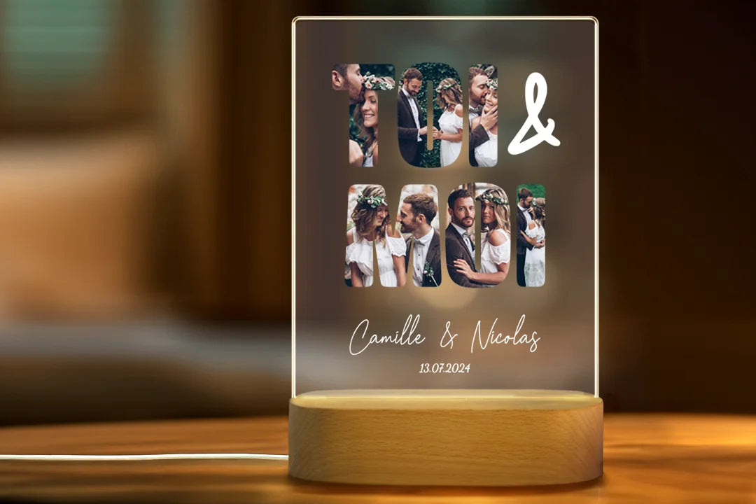 +La lampe est fabriquée en acrylique transparent de qualité, accompagnée d’un socle en bois. L’ensemble offre un rendu moderne, stable et durable.