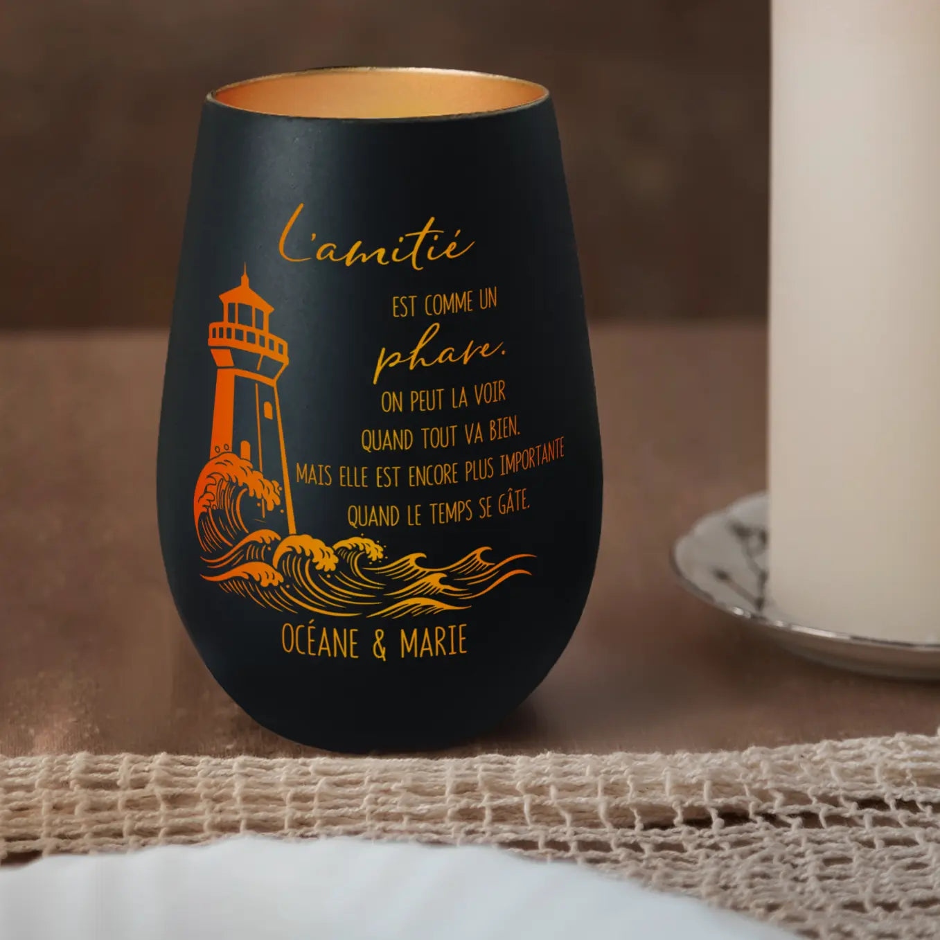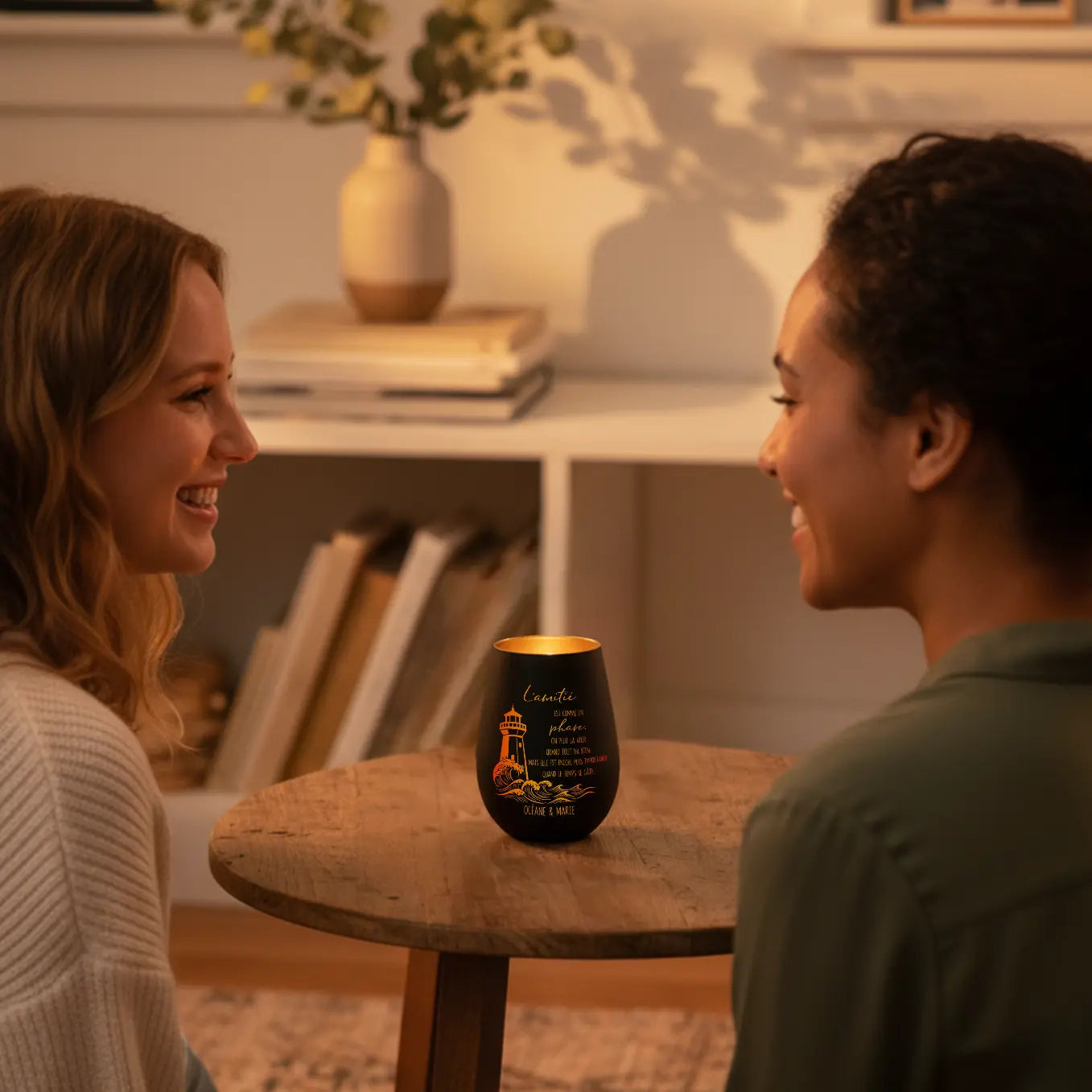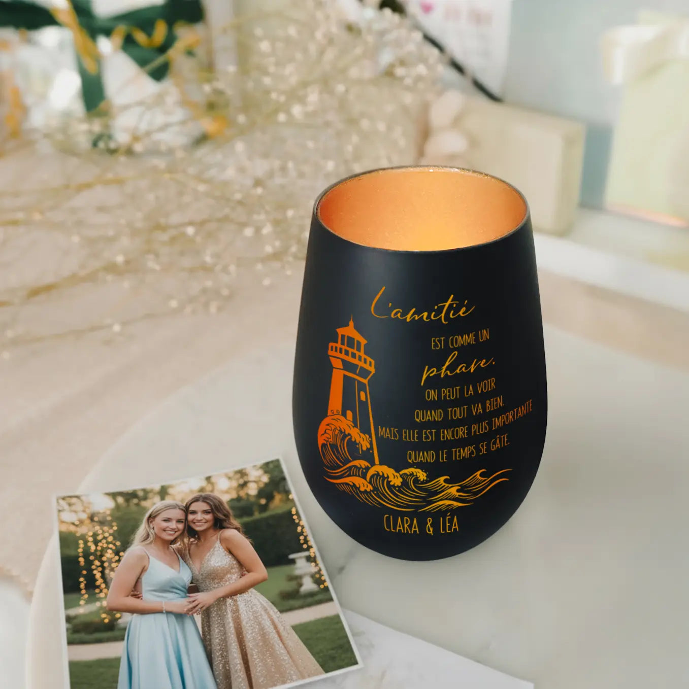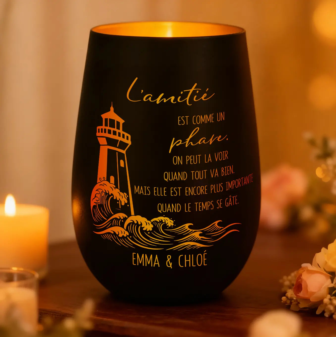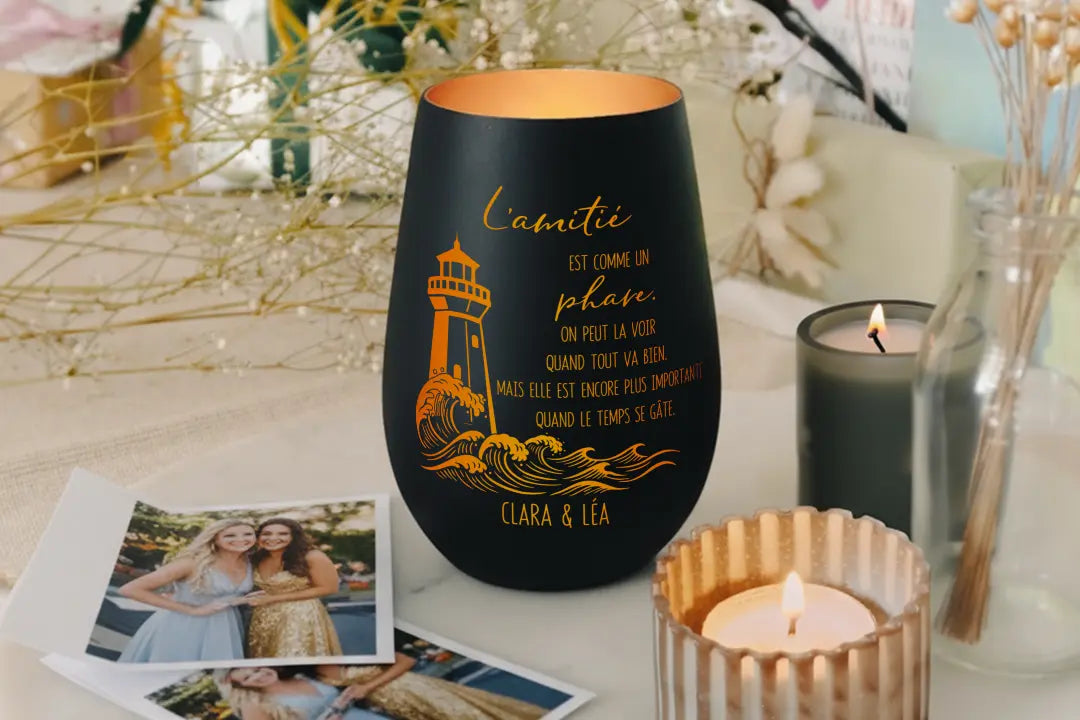 +Le motif et le texte sont gravés avec précision. Une fois la bougie allumée, la lumière fait ressortir la gravure et illumine le design, créant un rendu chaleureux et élégant.