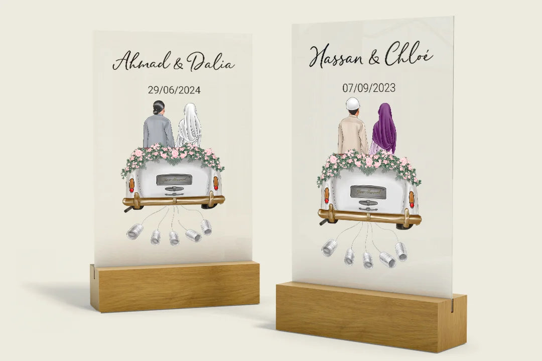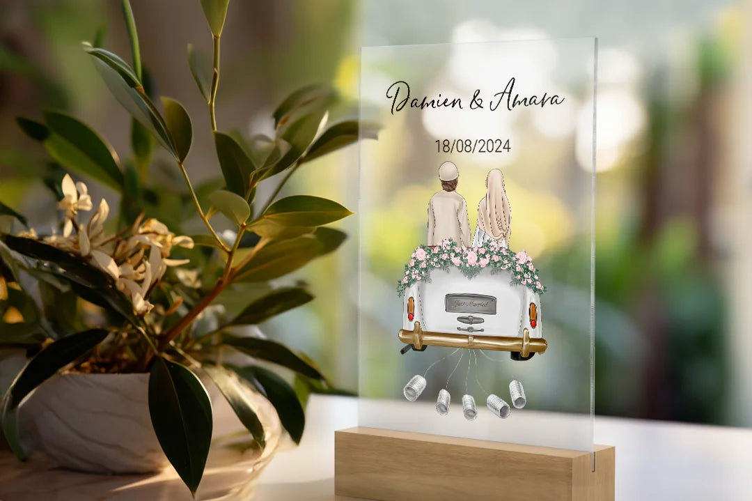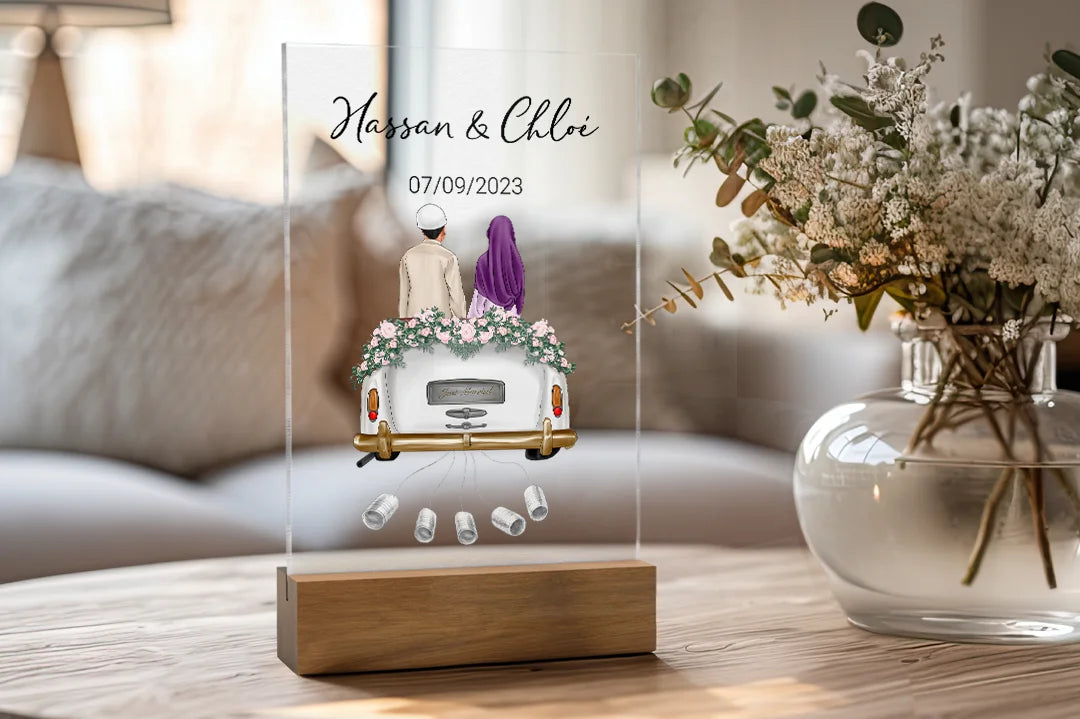 +Le présentoir en acrylique représente des boîtes de conserves accrochées à la voiture de mariage, auxquelles vous pouvez coller de vrais billets avec de petits rubans ou des clips.