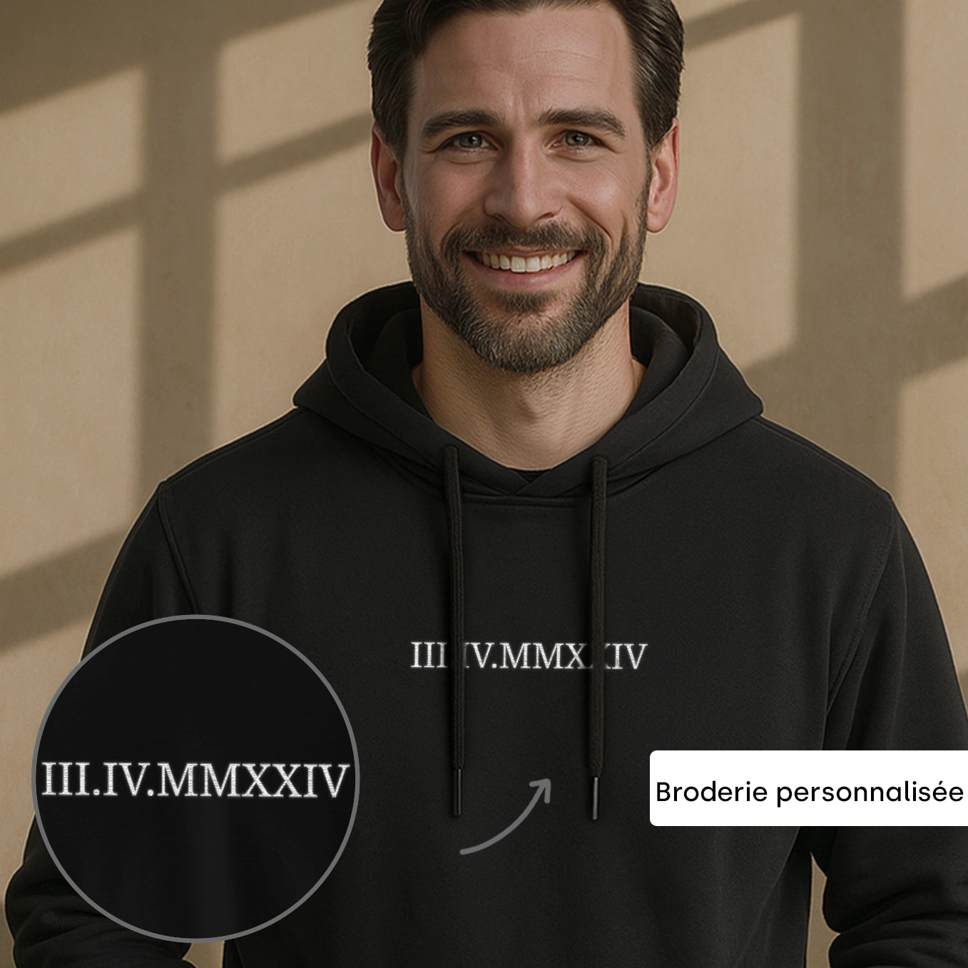 Comment la date est-elle affichée sur le sweat à capuche ?