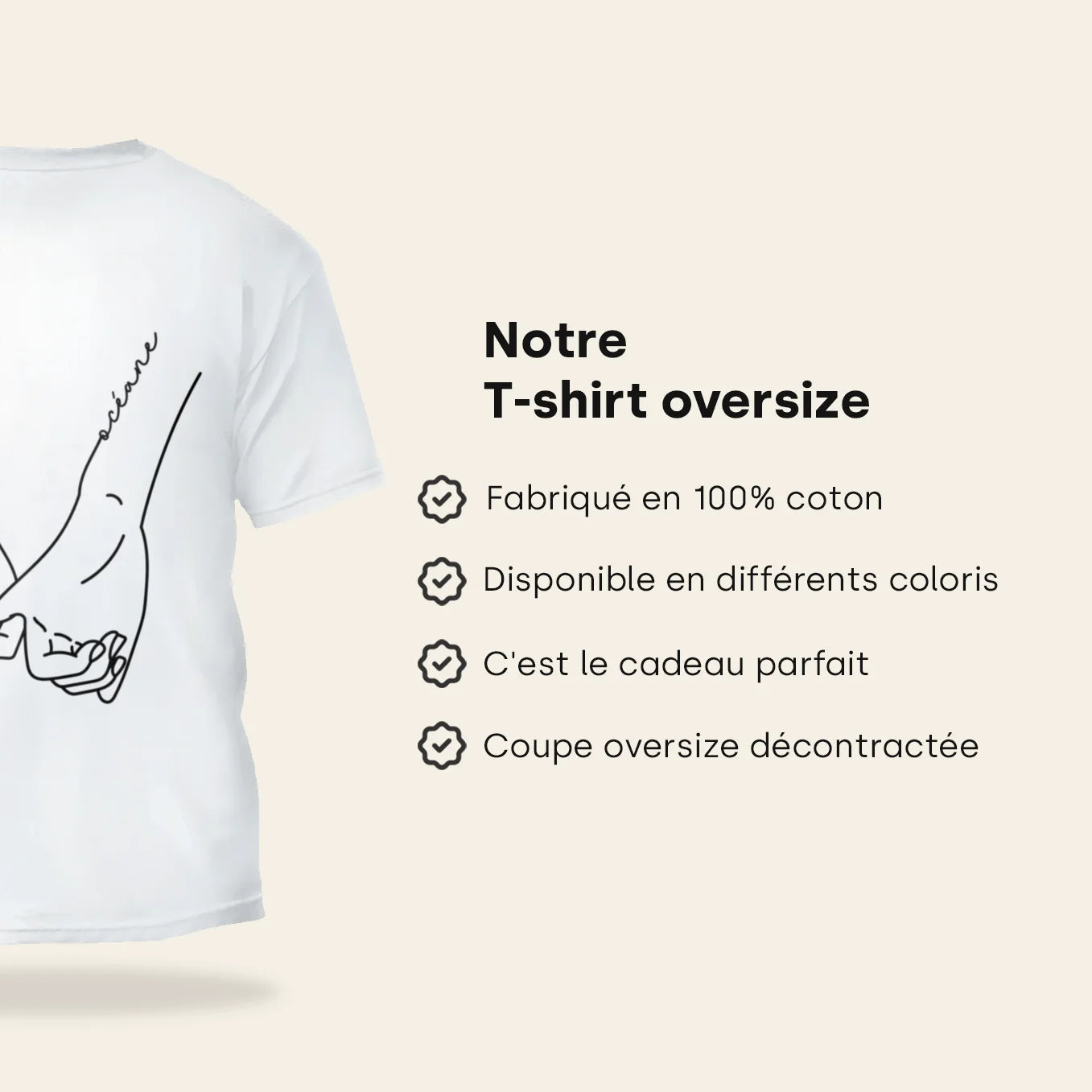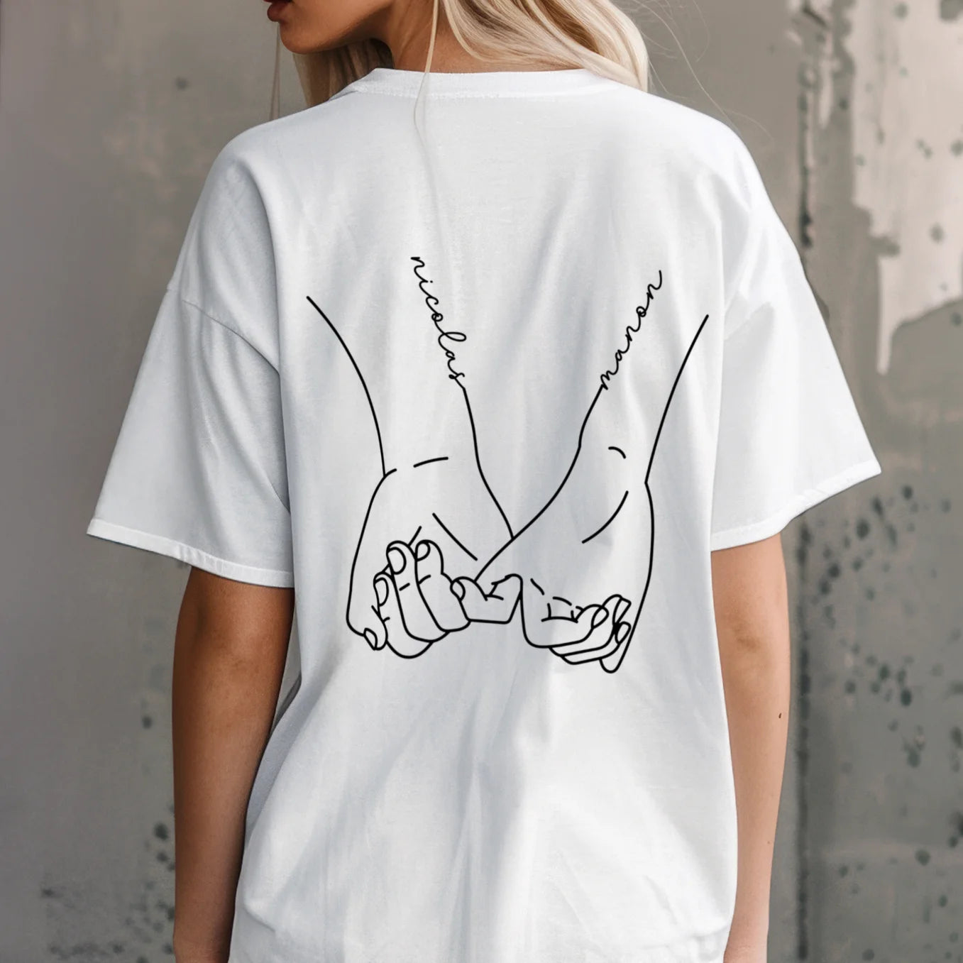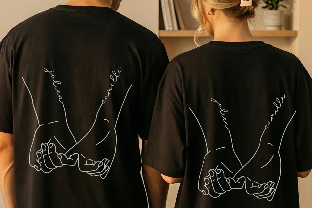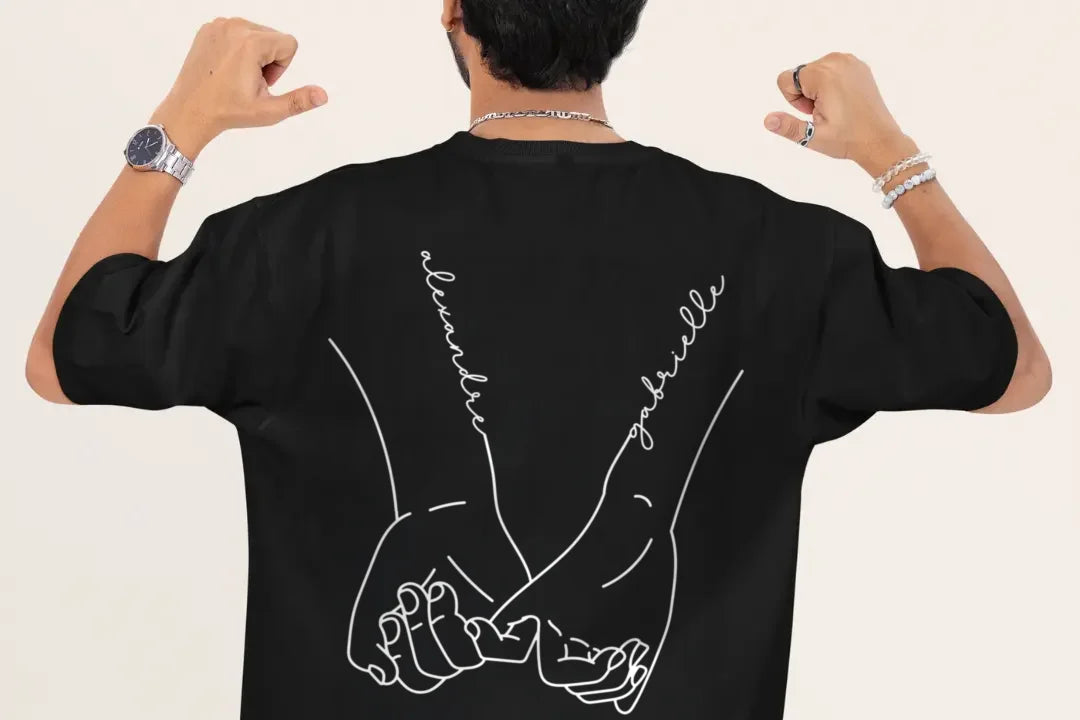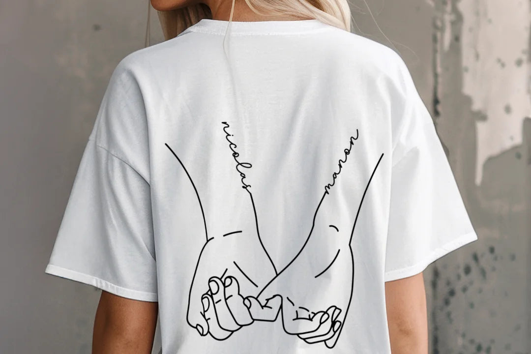 +Les prénoms de votre choix sont imprimés avec soin au dos des t-shirts, intégrés au motif mains pour un rendu harmonieux et élégant.